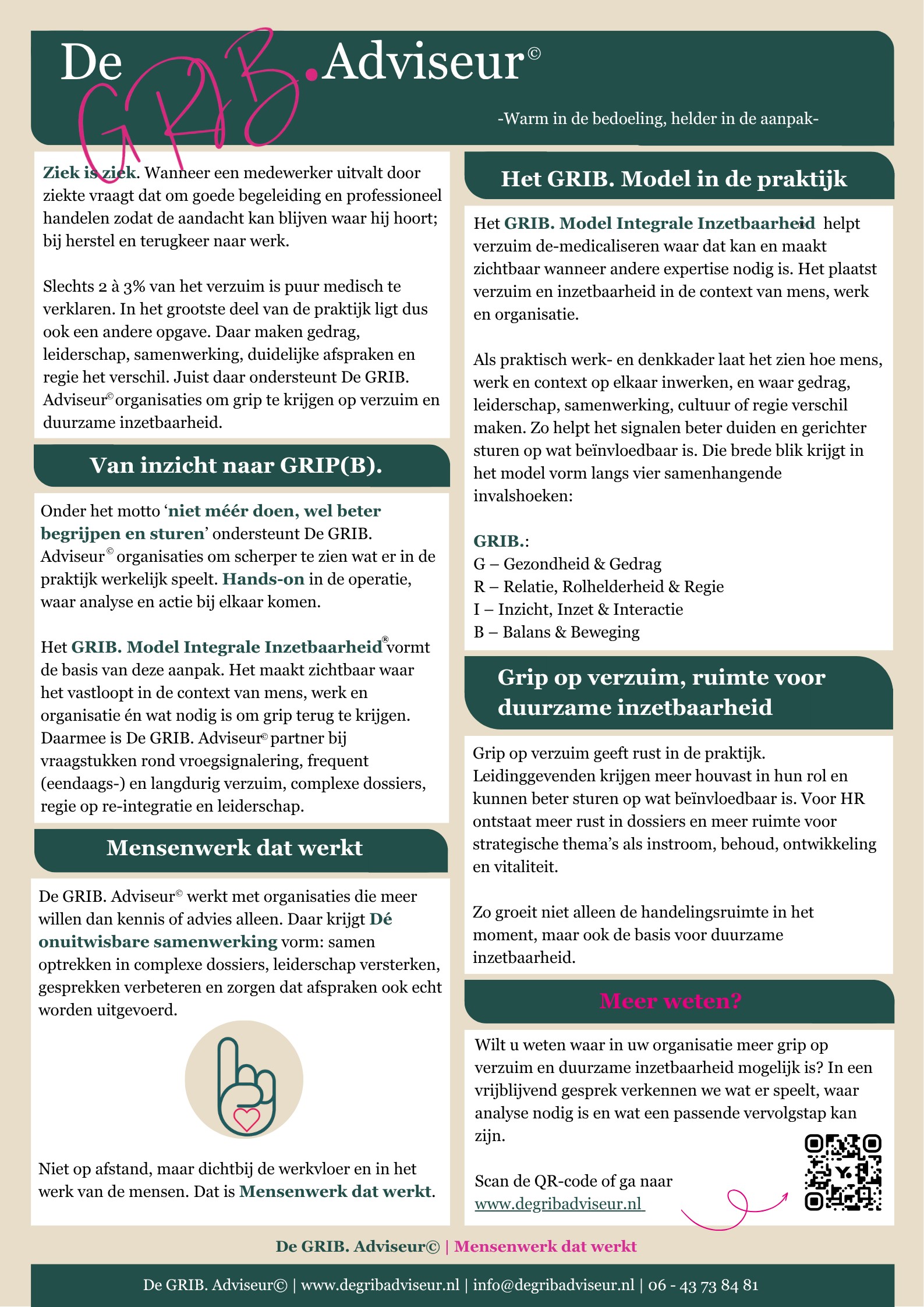 De aanpak van De GRIB. Adviseur© is gebaseerd op het GRIB. Model Integrale Inzetbaarheid®: een op wetenschappelijk onderzoek en praktijkervaring gebaseerd, praktisch denk- en werkkader dat helpt om factoren die van invloed zijn op verzuim en inzetbaarheid in samenhang te bekijken. Denk aan gedrag, werkdruk, verwachtingen, rolverdeling, samenwerking, herstelruimte en de manier waarop regie wordt genomen in het proces.
