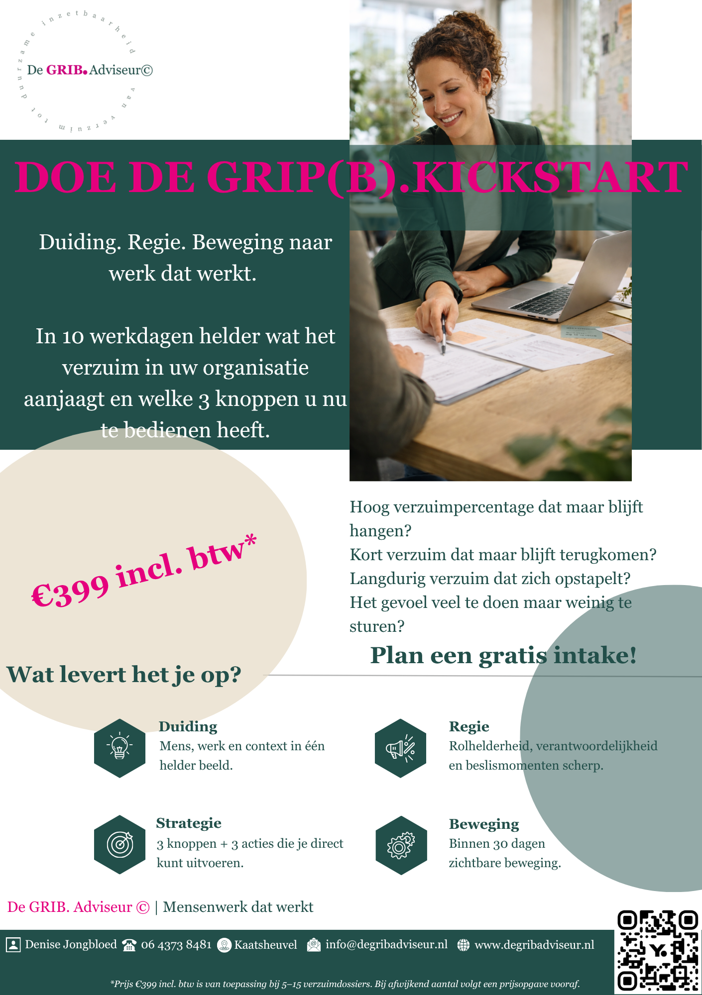 Met de GRIP(B)-Kickstart krijg je in korte tijd helder wat het verzuim in je organisatie aanjaagt en welke 3 knoppen je nu te bedienen hebt. Geen uitgebreid rapport, maar een compacte analyse met scherpe duiding, duidelijke keuzes en concrete acties.