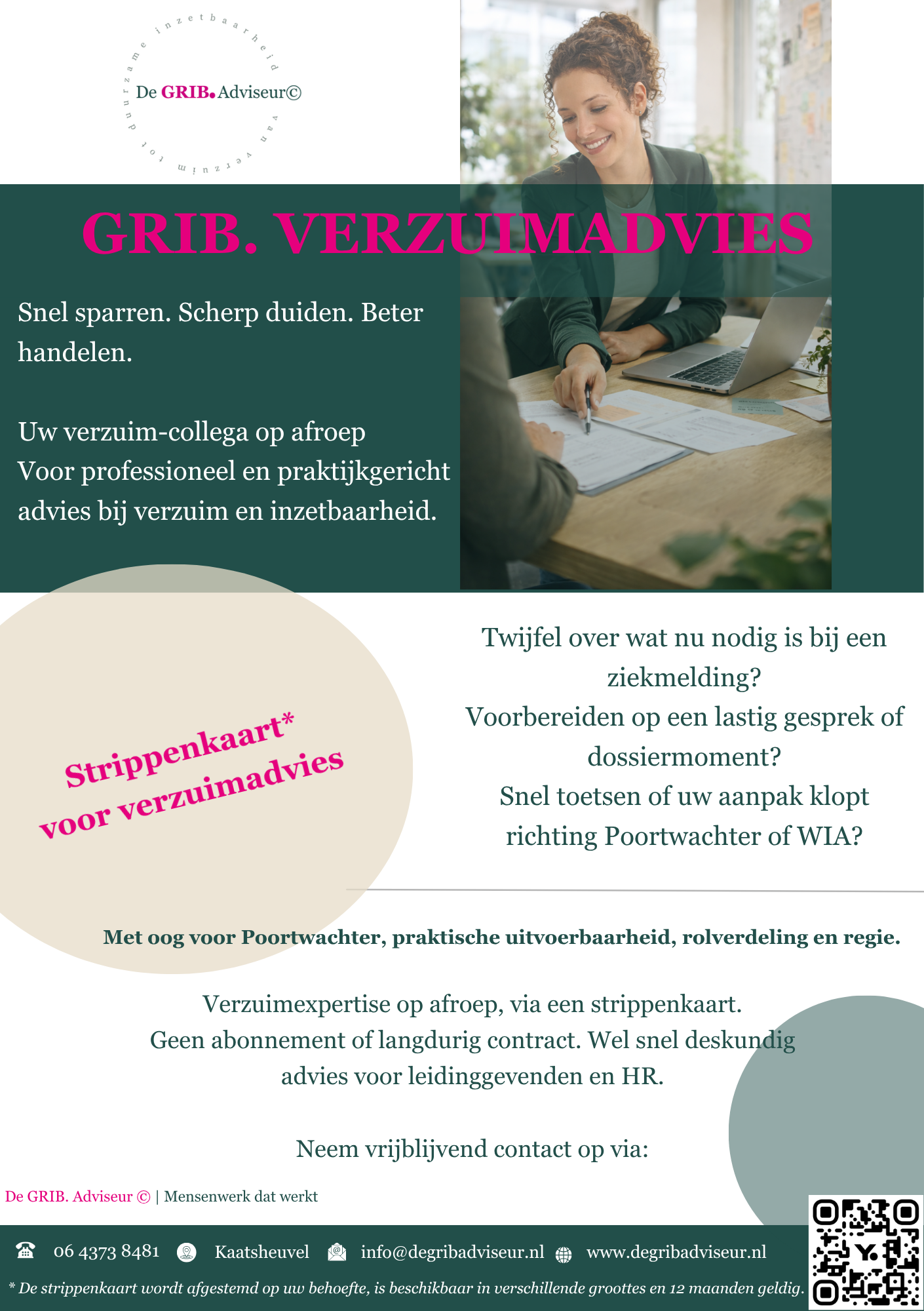 Soms heb je geen extra casemanager nodig. Soms heb je vooral iemand nodig die scherp meekijkt, het patroon achter de ziekmelding duidt en helpt bepalen wat je nú te doen hebt, binnen de Wet verbetering poortwachter én passend bij de praktijk. Verzuimadvies van De GRIB. Adviseur© is een flexibel in te zetten advieslijn voor leidinggevenden en HR. Een verzuim-collega op afroep, waarmee je snel en professioneel kunt sparren over verzuim en inzetbaarheid.